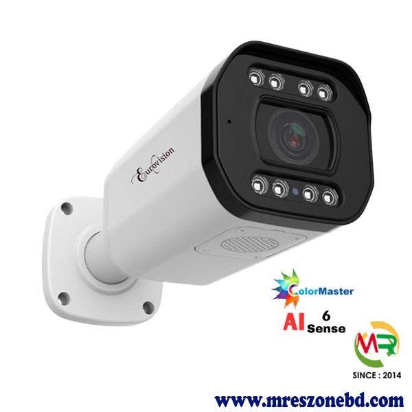 The Eurovision EV-IPC-716-AI is a cutting-edge 6MP AI Smart Metal Bullet IP Camera, engineered for high-accuracy surveillance in commercial, industrial, and smart security environments. It supports multiple high-definition resolutions up to 3072×2048 @ 25fps, ensuring superior clarity in both day and night conditions. Powered by Eurovision’s advanced AI 6Sense technology, the camera offers six intelligent detection features such as loitering, line-crossing, area intrusion, illegal parking, retrograde vehicle movement, and staff absence monitoring — enabling proactive security automation. Equipped with dual-light night vision, built-in microphone & speaker, S265 compression, and PoE integration, this model is a complete professional-grade solution trusted by MR Electric & Security Zone.